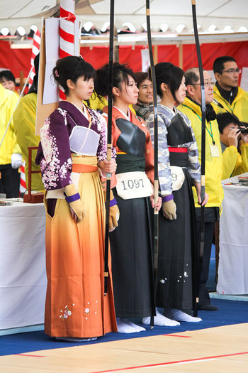 A hakama is a wide-pleated, ankle-length skirt that has 7 pleats, 5 in the front and 2 in the back. They are always worn over a kimono. Traditionally a hakama was tied around the waist over a sash called an obi with ribbons. Ancient Japanese Samurais wore these hakamas so that their opponents in war could not see their footwork. Traditionally these were only worn by men, but now these hakamas can be found on women, especially for kyudo (martial arts) (Lad).