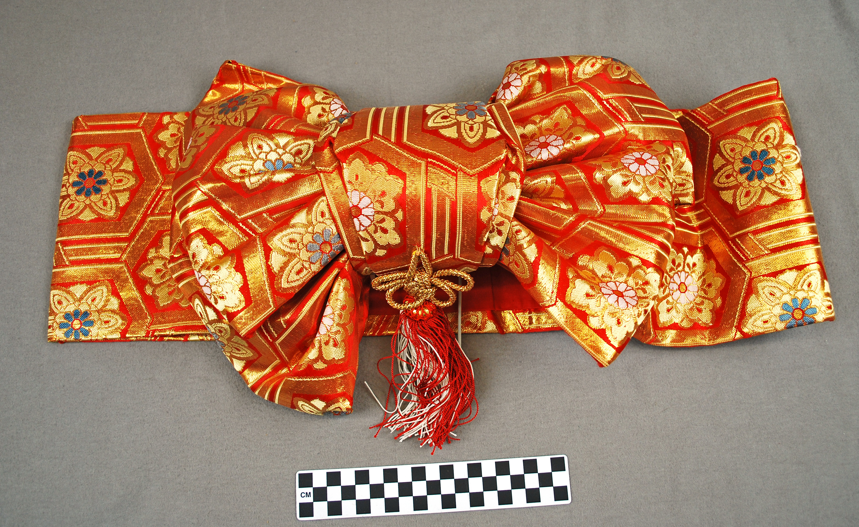 An obi is a large sash used to keep a kimono in place. Men usually have a thinner, subtler obi than women. Women’s are thicker, more decorative, and have many more ways to tie their obi than men (All About Japan). Obis can be tied in many different knots, each having a certain meaning. In ancient times, the knots were thought to keep evil spirits away. We also see that the color of the obi is how Japanese martial arts show the rank of the individual (Lad).